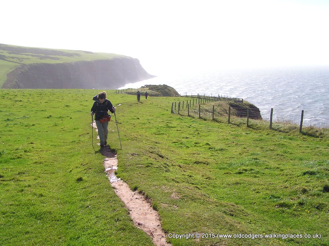 'Mary, David & Robyn leaving Fleswick Bay along the cliff top'