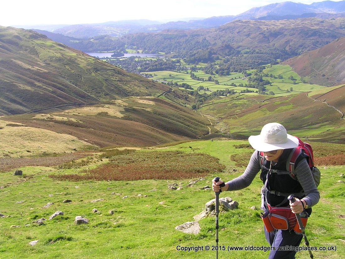 'Mary at the top of Great Tongue, Grasmere and Dove Lake in the valley below'