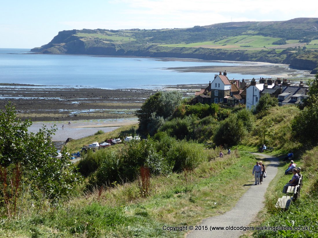 We walked along the beach past Boggle Hole, then climbed the cliffs at Stoupe Beck. The Cleveland Way path that we followed along the cliff top through farmland under a warm, blue sky with a cooling westerly breeze was very pleasant. After passing the old alum works, the path climbed steeply through woods to Ravenscar. And there was the view that we had admired for years on the cover of the Harvey map – from the Ravenscar hill looking over the cliffs, bay and Robin Hoods Village under a blue sky, a postcard picture.