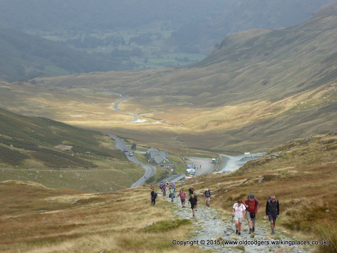 We shared the top of Haystacks with 30 other walkers. We descended to Innominate Tarn, passing more walkers on the way. Wainwright's final resting place was as beautiful as we remembered it. We followed the rocky path to Dub's quarry, avoiding the path down to Buttermere that lured us in 2010. The rocky descent to Honister slate mine was slow and painful – our feet were unhappy. We were not as unhappy as some members of a large walking party slogging up the hill at the end of a long walking day. We stopped at the mine for a cold drink.