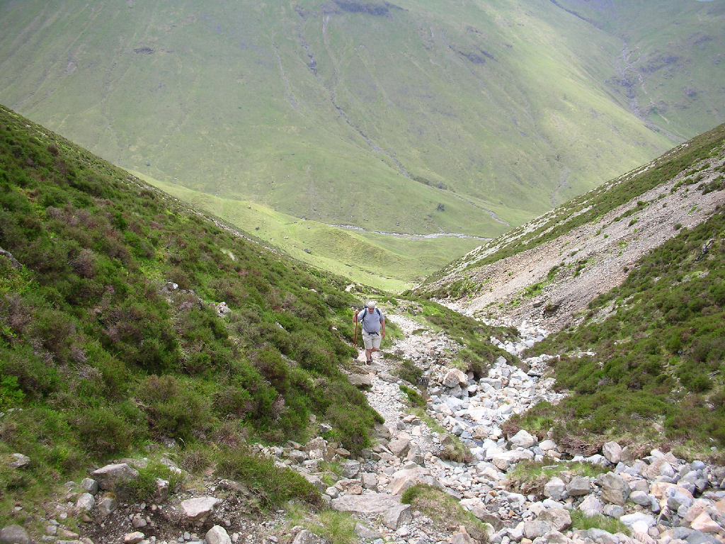 Tuesday 13 June - Ennerdale Bridge to Stonethwaite We were both awake bright and early this morning after a decent nights sleep – I found in difficult throughout the entire walk to sleep all night partly due to the birds singing, the early morning brightness and to be honest the adrenalin and excitement of what was to come each day. That may sound immature but that’s how it was – I had planned this walk for months and wanted to enjoy every minute of it. We had a substantial full English breakfast at 8am and spent some time chatting to the hosts about life in Ennerdale Bridge. They had left the tenancy of the Shepherds Arms Hotel 9 years ago and ran the B & B since. The village shop had been closed for well over 12 months and a number of properties had been purchased as second homes. I have seen similar situations develop in the Yorkshire Dales and sadly village life had suffered – let us hope this does not happen in Ennerdale Bridge – perhaps the frequent procession of C2C walkers will ensure village life stays alive. The Cloggers is in an area of Ennerdale Bridge called Tom Butt and we tried to establish the origins of this name. Was it a famous villager? No apparently it was derived from norse but the hosts couldn’t tell us exactly what it meant. We were off by 9am and strolled out of the village towards Ennerdale Water. As we reached the car parking area at the head of Ennerdale Water we saw two groups of 4 C2C walkers alight from vans and start off towards Eagle Crag - what’s this all about having a lift so early in the day! We saw the two American couples who had stayed at Stonehouse Farm and exchanged a brief good morning with them before walking alongside a husband and wife team doing the C2C. They were backpacking and intended staying at camp sites where possible or wild camping if necessary. We chatted as we walked along towards the waters edge – they had stayed at Ennerdale Bridge camp site and were disappointed at the standards on the site. They were equally disappointed that they could not replenish supplies as the village shop had been closed some considerable number of months but their guide books and advance information did not indicate the shop was closed. They had arrived in Ennerdale Bridge late and had great difficulty at 9pm getting a meal. All in all they were not happy with Ennerdale Bridge but I could tell we had met two seasoned campaigners who were out to enjoy their walk whatever. I met this wonderful couple, Ian and Val from Sunderland, later in the walk but as we reached the junction of paths leading to the south and north shore routes we said goodbye to them as Malc and I were taking the longer but slightly easier north shore route partly because I was looking for a geocache on the north shore. As we walked along the western end of Ennerdale Water and looked towards Eagle Crag we saw a steady procession of walkers including the 10 people we had seen earlier. A rough count suggested 18 people were walking towards or around Eagle Crag and others were following us. We made swift progress along the north shore route taking in the views across to Pillar on the right and the expanding views of Great Gable as we neared Black Sail Hut. It was on this section that I decided to try and beat Malc at ‘theme of the day – film/TV stars’. Things started very well for us both but his superior knowledge – or was it cheating? won the day when he threw in some ‘supposed 1920’s film star’ that I had never heard of. I raised the white flag well before Low Gillerthwaite Youth Hostel and decided that it was a bad idea to take Malc on at this ‘sport’. The group on the south shore appeared to be making slow progress around Eagle Crag and it was therefore no surprise to us that (as far as we were aware) we were the first to reach Black Sail Hut that morning. We arrived shortly after midday – I checked the GPS ‘10 miles in just over 3 hours – not bad eh Malc’. The weather had been fine, warm and dry all morning and despite the thin high cloud the forecast was good. We re-hydrated and made a decision to have our packed lunch at Black Sail Hut to wait for some of the other walkers on the C2C. Yes, I know we would then have to achieve the 1000 feet climb in half a mile up Loft Beck just after lunch. There was no one in Black Sail Youth Hostel but we topped up our water and signed the visitors book. ‘What a wonderful oasis surrounded by beauty on all sides’. This was a magical place and I am pleased we decided to sit outside on the solitary two person bench to have lunch. I could have stayed there all day and I am sure Malc felt the same way. As we approached Black Sail Hut we saw a piece of very short green grass directly in front of it – it looked the ideal picnic spot but on closer inspection there were thousands, and that is no exaggeration, of small brown winged iridescent beetles. The two man bench seemed ideal and as we sat there we saw a solo male walker approached from the Great Gable direction. As he arrived we had a chat – he was from Holland on a walking holiday across the Lake District. He had stayed in Wasdale and he had walked via the Black Sail Pass and Scarth Gap taking in the High Stile range before descending into Ennerdale Bridge. He was enjoying his holiday and spent some time in Black Sail before moving onwards and upwards. As we sat there enjoying our lunch I noticed that Malc was having difficulty fending off the squadrons of these flying beetles with his javelin like walking pole. They flew in from a southerly direction in waves of 6-10 and often landed on Malc – he was wearing shorts and I was wearing Ron Hill Tracksters – I had warned him about the possibility of ticks but had no idea that the extended families of Paul, George, John and Ringo would be attracted to him. What was strange is that they never bothered me – work that one out. We sat there for almost an hour keeping an eye on the path from Ennerdal