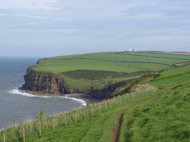 When we reached St Bees Lighthouse at North Head we stopped for a quick rest. It was roughly around this time that Darryl got out his little portable radio and tuned into the Olympics. It was quite a welcome distraction from the hard slog to listen to the Brits doing so well in the cycling events. Not long after St Bees Lighthouse the path started to get quite muddy and in some places runs quite precariously close to the cliff edge which in some cases meant we had to divert into nearby fields. A mile or so on we reached the quarry and the point where the path turns inland, but not before negotiating a very wet, muddy and overgrown path by the very edge of the cliff with disconcerting views of the lovely cliffs and sea below.