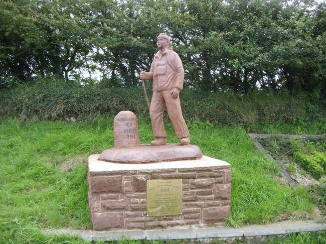To the right of the statue was an arrangement of shrubs that spelled out ‘Moor Row’ which was the small village just down the road. We hoped Moor Row might be a good place to buy supplies. It wasn’t. The newsagent was derelict and the post office had been boarded up and closed down. We saw a local man approaching and asked him if there were any shops. He replied with a simple and unashamed ‘bugger all!’ We sighed and continued on hoping we might have more luck in Cleator. Shortly after Moor Row we saw another, more unusual monument to the Coast to Coast Walk.