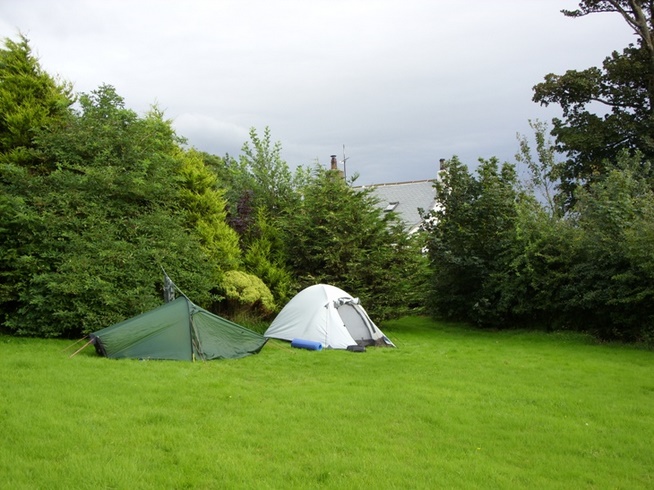 We turned off the route and followed the path toward the farm after saying goodbye to Denise and Stuart who had booked themselves into bed and breakfasts along the whole route (lucky buggers). The woman at the farm welcomed us and showed us to a small grassy area where we could camp. It was actually a really nice place to pitch our tents. We had the area all to ourselves, and though it was windy there were trees and bushes to keep most of the wind away. We also had use of a small TV room (actually a shed full of junk with armchairs and TV) and the toilet and shower at the back of the farmhouse that was also used by the bed and breakfast guests. The farm had several dogs too. By my count there were two Border Collies, two Rottweilers and a cross-breed. Anyone crazy enough to drive all the way to Low Cock How to burgle the place would be mauled to pieces in seconds. We pitched our tents and the rain returned as we made a dinner of noodles and tinned mackerel followed by chocolate digestive biscuits. We showered then sat in the TV shed for an hour or so watching a Porridge film. It was actually a very relaxing evening and just what we needed after a surprisingly tiring first day. It was still raining a fair bit when we left the shed to head back to our tents for the night. We crawled into our bags aching and tired to read for a while before sleep.