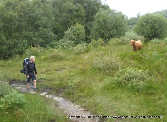 Once again we woke to a cold, misty morning. A rooster and several chickens were mooching about as we had breakfast and started packing away the tents and the rest of the gear. The rooster crowed every time a rooster on a neighbouring farm did the same, ensuring that no one was asleep after about five minutes of the racket. We were fairly quick getting ourselves organised and managed to leave the farm before anyone else, retracing our steps down the road toward Drymen but turning off through a small stile near a brook. We climbed a small hill with a signpost for the way at the top and then followed the path toward Garadbhan Forest, being overtaken at one point by two retired American guys with whom we’d meet up again later, most significantly on the last day of the Great Glen Way almost two weeks later.